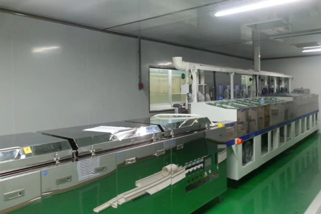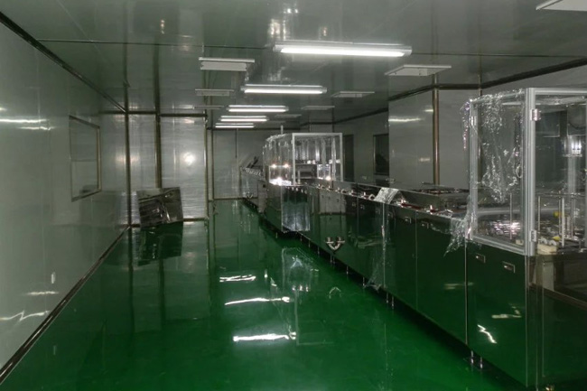 3、食品厂无尘车间物流由外走廊经过机械连锁自消毒传递窗消毒后进入缓冲走廊后再经过传递窗进入各操作室。